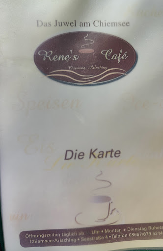 Read moreEtwas versteckt und daher entfernt vom "Sehen und gesehen werden" ist das Rene's Café ein kleines Einod, im besten Sinne. Es gibt eine kleine, obere Terrasse und die Treppe runter, eine etwas größere Terrasse (vielleicht gerade 9 Tische?). Massen sucht man hier vergeblich und das macht René's Café, am oft so stark fbesuchtem Chiemsee so besonders. Eher still und gediegen als laut und aufgesetzt, schmeckt der Kaffee und Kuchen (siehe die ersten beiden Seiten der Speisekarte) wirklich ausgezeichnet. Ja, der Blick auf den Chiemsee ist kein 180Grad Blick aber trotzdem ist dieses Café sehr empfehlenswert. Vielleicht oder gerade auch bei schlechtem Wetter denn das Innere besitzt...
