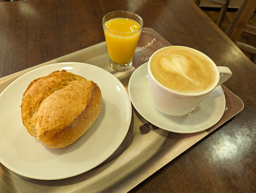 Bakkerij, open vanaf 8 uur. DE plek,midden in het centrum, om te ontbijten (de hele dag door), lunchen, koffie met een van de fantastische taarten, of zoete broodjes, alles uit eigen bakkerij. Hoge kwaliteit voor een prima prijs. Op 50 meter afstand een P-Garage waar je voor Nederlandse begrippen voor weinig parkeren kan. Op 30 meter H&M , met een net iets ander assortiment dan in Nijmegen. Fielmann, voor brillen en lenzen HET adres, zeer goed geschoold, ervaren personeel en een service die je in Nederland niet zal vinden. Na het ontbijt rechtsaf, op 25 meter de DM (Drogerie Markt) Ook weer ongekende kwaliteit voor goede prijzen. Behalve wat hevin een drogisterij mag verwachten vind je er een ruim assortiment aan Biologische voedingsmiddelen. Ook hier geldt: topkwaliteit voor een klein prijsje. DUS: begin de dag met een van de orima ontbijten eb verken het centrum. Verken vervolgens eens het EOC winkelcentrum aan de Hofmannallee. Of maak tijd om het MKK Museum Kurhaus Kleve te ontdekken....