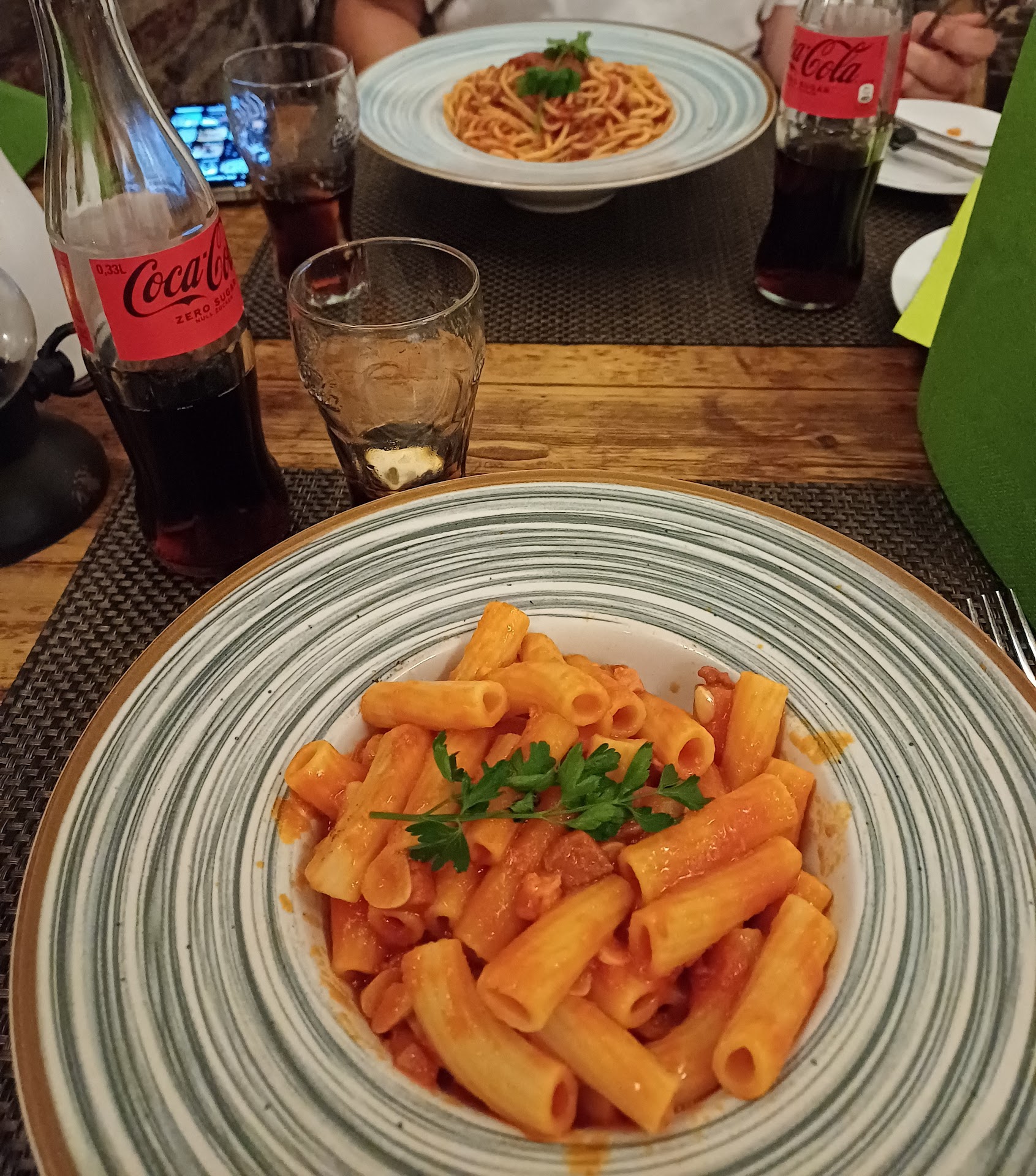 The second night, we started upstairs on the terrace again.We started with Bruchetta and tomato soup. before we even got our food wasp, we were flying around us and other tables. my friend who gets really sick if she is stung by a wasp or a bee. They were flying near us more and I got stung two times. We asked if we could move downstairs cause my friendcouldn'tt get stung or she ger sick. The girl said shed ask. Then our starters came alrsady. and while every other table got the two pieces of bread again, we didn't. The man I presume is the owner. He was looking upstairs again and saw us still sitting there. he spoke Dutch and English the day before but now only spoke German. The nice waiter took our food. we had to take our stuff downstairs while also carrying our bottles and glasses and also the plate with our cutlery. we could sit at a table downstairs. This time, I ordered pasta Arrabiatta with cheese and my friend, the Bolognese. the spice level next to the arrabiata said 2/20. when we got our food. it looked really good. My pasta was so spicy that I'm scared for spicy level twenty. my friend liked the bolognese, but her portion was too big, bigger than I had the day before. i didn't like the pasta cause my mouth was on fire and burning. my glas was empty before I even had a quarter of the food. I found chunks of cut up red pepper in there. we didn't get asked if everything was okay we didn't get asked if we wanted another drink , nothing. servers seemed to not pay attention to our table. the presumed owner seemed grumpy and annoyed. not a good 2nd day. had to get milk at a store cause my mouth was still on fire won't be...