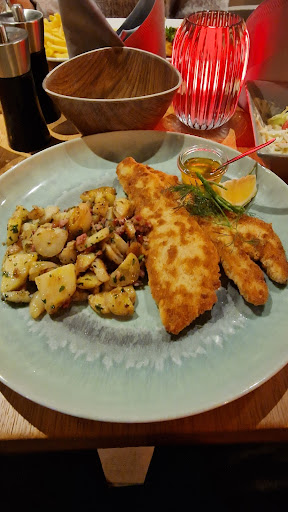 Der 2te Tag war generell auch super gestaltet von der Bedienung bis zum Koch waren wir wieder mega überzeugt. Mir wurde eine "extra Wurst" beim Getränk gebrüht. Da wir zuvor eine Schnabsverkostung hatten gabs nur Alkoholfreie Sachen zu trinken . Kirschbannanensaft gab es nicht auf der Karte aber letzten Endes stand er auf meinen Tisch 😉.. Zu essen gabs leckeren Seelachs paniert mit Bratkartoffeln . Dazu eine Senfsoße die seines gleichen sucht. Generell habt ihr ahnung was Fisch 🐟 und Soßen angeht so wie das drum rum ..! Weiter so.. Für meinen Fleischfresseden Engel gab es auch einen leckeren Zander mit Knobibratkartoffeln. .. Achso und das mit dem Salat am Anfang kommt auch richtig gut an das man sich alles zusammen stellen kann wie man will . Falls jemand bis hier hin gelesen hat denke ich wirst du heute abend dort hin gehen . Falls du Mitarbeiter in dem Team fischfritz bist , danke für die 2 Tage Leckeres Mamam