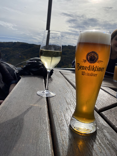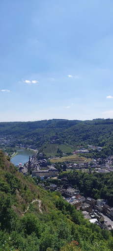 The Sesselbahn-Terrassen-Café in Cochem offers a truly beautiful view once you get to the top. Unfortunately, the experience was a bit disappointing. This is the only café on the mountain, and they only accept cash. Luckily, we had just enough with us. Prices are very high, clearly taking advantage of the location and the fact that they are the only place to rest and drink/eat something. We paid over €30 for two small pizzas (not great, but acceptable) and two soft drinks.