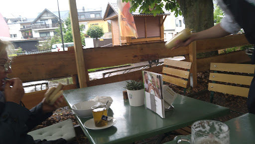 bei Regen Wetter - anwesenden zwei Gästen mit Getränk - und uns 20 Bus Gästen ist das Servicepersonal total überfordert gewesen -