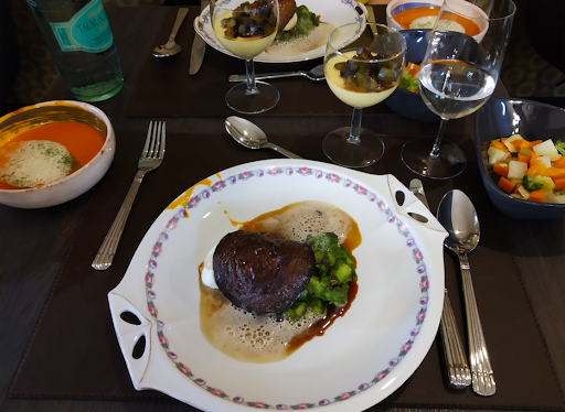 Präsentation: Die Präsentation der Gerichte und Komponenten fanden wir insgesamt noch zufriedenstellend. Die Farben fanden wir gelegentlich ansprechend, aber nicht besonders hervorhebenswert. Das Dekor war oft recht ansprechend, i. W. in Bezug auf das Geschirr. Abgesehen vielleicht von den Amuses fanden wir die Texturen nicht besonders erwähnenswert, die Küche hielt sich hierbei u.E. auffallend zurück. Abgesehen von drei simplen Überraschungen wurden keine erwähnenswerten Effekte gezeigt (z.B. Positionierungen, skulpturales, Farbeffekte, Fake-Effekte, olfaktorische Effekte u. dgl. mehr). Die Serviceintensität am und um den Tisch war aus unserer Sicht auffallend gering. Die Einstimmungen auf die Gerichte fanden wir simpel. In keinem Fall wurden Komponenten am Tisch hinzugefügt oder verändert. (Teils könnte dies allerdings den Maßnahmen aufgrund der Pandemie geschuldet gewesen sein.) Das Timing fanden wir insgesamt zufriedenstellend. Die Portionen fanden wir häufig (Vorspeise, zweiter Zwischengang, Hauptgang und Dessert) und teils deutlich zu umfangreich bemessen. Die Präsentation der Weine hat uns gut bis sehr gut gefallen. Der Stil klassisch und gelegentlich mit netten Einstimmungen und Erläuterungen.