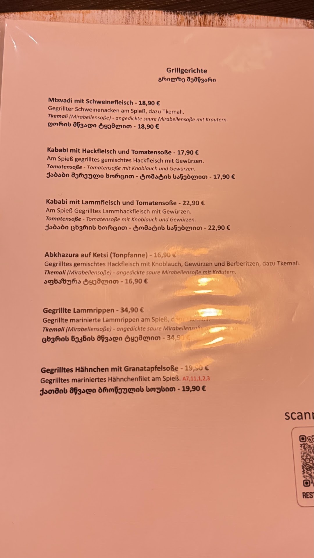 Read moreВ заведение мы пришли втроем и заказали: два шашлыка (Mtsvadi mit Schweinfleisch), хачапури (Acharuli Khachapuri), два хлебца с фетой (Mchadi), две жареные картошки (Bratkartoffeln), хинкали (Khinkali), аджика, две воды, два пива. Счет вышел на 122€. Заведение работает на немцев. Меню не предложили на русском языке, а также девушка встретившая нас сделала вид, что не понимает по русски или же действительно его не знает. Интерьер уютный, симпатичный и это один из немногих плюсов. Помещение узкое и длинное и нам пришлось присесть вначале где недалеко была входная дверь, которая то и дело открывалась сотрудниками и создавала сквозняк и дверь на кухню, куда беспрерывно что-то заносили/выносили, например половую тряпку с ведром, грязные полотенца, грязный поддон для кофейной машины и сотрудники выносящие себе десерты. Таким образом эта зона выглядит скорее зоной ожидания, но то что нам в конечном итоге так и не предложили пересесть - не главный минус этого заведения. Наш заказ принимала девушка афроамериканка, которая услышав удивление о том, что тархун стоит 6.70€ сообщила, что она понимает русский язык😁 Хоть в Германии это неудивительно, хочется все же упомянуть, что по этикету меню подают сперва дамам, а затем мужчинам. В этом заведении, к сожалению, все наоборот, как и почти везде в Германии. Свой заказ мы ждали примерно 40 минут. Удивительно что грузинское заведение, да и еще и позиционирущее себя как относительно элитный ресторан непросто долго готовит, но и не сочли нужным поставить на стол закуски, дабы сократить время ожидания, но это было только начало, ведь первыми блюдами на столе появились одновременно две мини лепёшки с «фетой», хачапури и хинкали, при этом хачапури и хинкали были заказаны одним человеком. Другими словами один гость должен был одновременно есть хачапури и хинкали, в то время как другие два гостя, можно сказать, не получили ничего. Что из себя представляет лепешка с фетой (Mchadi) за 6.90€ - это твердая масса со вкусом манки диаметром примерно 8-10 см и высотой 1 см с дырочкой посередине😁 На вопрос официантке где же фета, официантка пыталась убедить, что она внутри, но спустя примерно час после того, как эти твердые, почти безвкусные лепешки пролежали на столе, вдруг официантка принесла три кусочка феты🤦🏻♀️ Следующим блюдом появившимся на столе была глубокая тарелка с жареной картошкой. Она простояла примерно минут 10, после чего были принесены два шашлыка, каждый с картофелем фри, о чем в меню не было упомянуто. А вот упомянутого в меню шампура, как раз и не было, как и ткемали. Вместо ткемали был какой-то другой зеленый соус😁 Мы были удивлены тем, что тарелка с жареным картофелем только одна и при этом ее поставили на край стола, где как раз никто не сидел😅 На вопрос это одна или две порции картофеля в одной тарелке, нам было сказано, что это одна порция, потому что мы одну и заказали. На самом же деле заказывали мы картофель, как гарнир к шашлыкам и соответственно две порции. Официантка, также как и с фетой, стала спорить и убеждать, что мы заказали одну порцию. Однако предложила доделать еще одну порцию. На вопрос прийдется ли снова долго ждать уверила, что в этот раз еда прийдет быстро, поэтому она пришла через полчаса😅 Хачапури большой и вкусный. В хинкали толстое безвкусное с неприятным запахом тесто, и мясо с бульоном, можно скащать, совершенно без спец