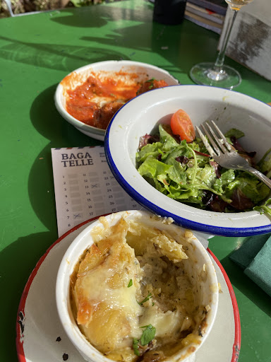 Wir hatten uns für einen Tag unter der Woche verabredet und trafen uns dementsprechend gegen frühen Abend an der Bagatelle. Es waren zwar einige Tische belegt, aber es war keineswegs überfüllt oder dergleichen. Am Eingang sprachen wir eine Person vom Service an und er teilte uns mit, dass wir draußen überall Platz nehmen dürfen, wo frei ist. Wir fanden schnell einen Sitzplatz, doch auf jedem freien Tisch stand noch schmutziges Geschirr uä. Kommt vor, ist überhaupt nicht schlimm und ich weiß selber wie es ist, im Service zu arbeiten. Die Minuten verstrichen und so langsam wurden die Tische abgeräumt und es setzten sich neue Kunden - nur an unserem Tisch passierte nichts. Es lag sogar noch die Quittung am Tischrand. Aber niemand vom Personal schaute uns an oder machte Anstalten, zu uns zu kommen. Nach knapp 25 Minuten sprachen wir die Bedienung an, die wir zuvor schon am Eingang angetroffen hatten, ob wir etwas zu trinken bestellen könnten. Er teilte uns mit, er sei nicht für uns zuständig und seine Kollegin würde gleich kommen. Na gut, dann haben wir eben noch etwas Geduld. Es vergingen weitere 20 Minuten (Kommunikation?) und mittlerweile hatten sogar Kunden bestellt, die deutlich nach uns Platz nahmen. Als dann die für uns zuständige Bedienung am Nebentisch eine neue Bestellung aufnahm, wollte sie wieder an uns vorbeilaufen, aber wir machten auf uns aufmerksam und fragten, ob wir etwas zu trinken bestellen könnten (nach über 45 Minuten an einem mit dreckigem Geschirr übersäten Tisch). Anstatt mit einem “Hallo” oder Lächeln oder der freundlichen Frage, “was wir denn trinken möchten” zu reagieren, entgegnete sie uns mit Kopf schütteln und dem Vorwurf, warum man sich an einen Tisch setzt, der offensichtlich schmutzig ist und wie das immer Leute tun würden usw. Wir antworteten ziemlich zügig, dass das bei unserer Platzwahl irrelevant war, weil bei unserer Ankunft auf JEDEM Tisch irgendwas rumstand, doch die Person sprach so weiter vor sich hin. Nachdem unsere Nachricht endlich durchgedrungen war, reagierte die Person nicht mit Einsicht oder Respekt oder ENDLICH mit unserer Bestellung. Es kam überraschenderweise der nächste Vorwurf, nämlich was das für ein Verhalten ist, dass man irgendwo einfach Platz nimmt (no offense, aber es gibt da keine goldene Regel für, es existieren genügend Cafés und Restaurants, wo die Leute Platz nehmen und kurz danach bedient werden). Wir verwiesen auf das andere Personal und erklärten, dass wir auch das getan hatten und nicht sofort Platz genommen hatten. Amüsanterweise kam dann kein Vorwurf mehr, aber auch keine Entschuldigung. Sie seufzte nur und sagte “ist mir jetzt auch egal” und räumte den Kram vom Tisch ab, würdigte uns keines Blickes. Und die Frage zur Bestellung kam überhaupt nicht mehr. Fand ich total kindisch und unprofessionell, zumal wir in dem Moment nicht nur Kundschaft sind, wir hatten uns auch durchweg korrekt verhalten. Noch während ihrer Anwesenheit konnte ich meine Freunde überzeugen, woanders essen zu gehen (schien sie ebenfalls nicht zu stören, sie sagte “wir können irgendwo anders essen, auch das sei ihr egal”).