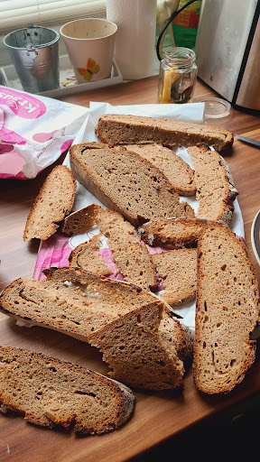 Read moreIch habe ein halbes Brot gekauft... Es sollte geschnitten werden...wurde es auch, nur total krum und schief. Ich habe es dann nur mitgenommen, weil es wahrscheinlich sonst weg geschmissen worden wäre... Aber ich glaube die Frau war neu und wurde nicht wirklich eingearbeitet oder so...Also so 5 Scheiben sind brauchbar,der Rest ist nicht für einen Belag geeignet. Eigentlich hätte ich mein Geld zurück verlangen sollen oder zumindest hätte die Verkäuferin von sich aus einen Erlass anbieten sollen...Naja beim nächsten mal dann...