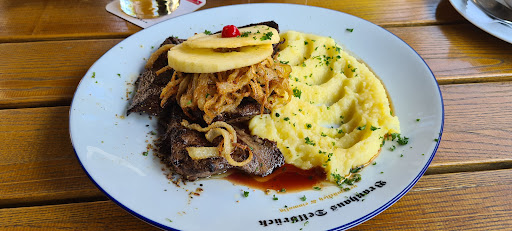 Ca 20 Minuten später nachdem wir mit der Suppe fertig waren kam der Kellner erneut zu uns und fragte uns was wir nun bestellen wollen wir hatten einen kleinen Änderungswunsch damit war der Kellner leider hoffnungslos überfordert laut Mittagskarte gab es an diesem Tag Rostbraten mit Kartoffelpüree als der besagte Rostbraten dann kam fragten wir dann wo die Füllung und die Röstzwiebeln in diesem Braten sein daraufhin nahm der Kellner das Besteck schob die Soße auf Seite und war selber ganz erstaunt dass keine Füllung im Braten war wenige Minuten später erschien dann ein sehr freundlicher Koch der uns eine Scheibe Rostbraten mit Füllung unter die Nase hielt und meinte nehmen Sie doch bitte diese ein Augenblick später stand er dann noch einmal mit warmer Soße vor uns.