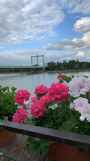 Wir waren einmal kurzentschlossen dort eingekehrt zur Mittagszeit. Vom Rheinufer aus ein paar steile Treppen nach oben und schon ist man am Empfang. Dort wird man freundlich empfangen und man erhält einen Tisch bei Verfügbarkeit. Die schöne Terrasse erwartet einen mit einen schönen Ausblick. Für nicht so fitte bleibt der hintere Bereich des Restaurants vorhalten da auf dem Weg zur Terrasse verschiedene Stufen zu überwinden sind. Im Brauhaus selbst gibt es ein uriges Ambiente ganz Brauhaus, auf der Terrasse sind wir mehr in Biergarten Ambiente unterwegs. Die Tische sind ok, das sitzen trotz Kissen wird mit der Zeit etwas beschwerlicher. Allerdings der Ausblick auf den Rhein mit seinen Schiffen und auf dem entfernten Dom sind schon schön. Das Rubbeln der nahegelegenen Brücke mit Autobahn hört man nur bei ruhiger Akustik jedoch bei voller Belegung ist es im Restaurant schon ziemlich laut und man merkt es nicht. Die Speisekarte soll man per Handy runterladen, ob es W Lan gibt kann ich nicht sagen, allerdings wurde verschiedenen auch eine normale Speisekarte gereicht. Ein leckeres gut gezapftes Kölsch erhält man schnell und als gewohntes Abonnement immer wieder neu.☺️ Die Bedienung gleich beim „Du“ machte aber einen gestressten , überforderten Eindruck was man am Tonfall, der gequellten Gesten von Freundlichkeit direkt merkte. Da half zum Schluss alles auch kein Trinkgeld. Schade das drückt schon die Freude beim bestellen. Die junge Abräumhilfe das krasse Gegenteil, immer unterwegs, sehrt sympathisch und freundlich mit guten Tipps auf freundliche Nachfrage. Hunde sind im übrigen sehr willkommen wenngleich es nur am Eingang eine Hundebar mir Wasser gibt für alle 4 Beiner. Das Essen zumindest an diesem Tag nicht so wie wir es in Erinnerung hatten. Freilich wir haben alles gegessen, hatten auch Hunger aber der Preis war dort leider nicht wiederzufinden. Die Reibekuchen und Klöße machten, auch weil kein Geschmack, den Eindruck gerade aus der Fertigpackung zu kommen. Das Rotkraut glich eher einen Brei und lies vermuten aus dem Glas zu stammen. Wo hingegen die Tomaten und der Dip einen überaus frischen Eindruck und auch gut abgeschmeckt waren mit einer guten würzigen Note. Unser Lachs 🍣 was halt Standard nichts besonderes aber auch nicht schlecht. Insgesamt war es aber leider enttäuschend. Für ein Restaurant mit solchen Ansprüchen. Natürlich werden wir es nochmals versuchen aber das wird wieder was dauern da es sehr gute Alternativen in der Nähe gibt. Die WC sind sehr modern und sehr sauber und für ein Bier werde wir auch kurzfristig...
