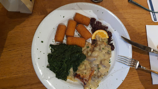 Very nice and cosy. The staff was very polite and helpful. It was almost full, so it is a better idea to reserve in advance. The turkey steak was hard and served with a salty mushroom sauce, spinach and Crockett. Unfortunately, my friend later revealed that the Gensebrust or the Goose breast was not fresh at all. It is pitty as my friend likes this dish very much and he was really disappointed. They could have told us that it is not fresh and we could have ordered something else. The waffle seemed good, nevertheless, not crispy at all and rather chewy. It was served with cream, cherry and vanilla ice cream. I had to revise this review after my friend having me told about the not fresh dish he had...