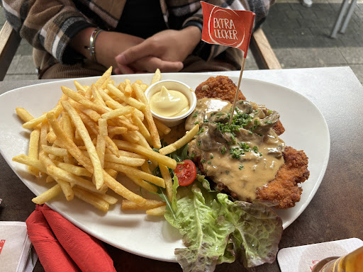 Read moreExtrablatt gehört wohl zu den gastronomischen Ketten, welche auf eine jahrzehntelanges Bestehen zurückblicken können. So war ich auch vor etlichen Jahren öfters schon dort und hatte eig. positive Assoziationen. Dies wurde hier allerdings herb enttäuscht. Das Flair ist noch dasselbe und die Menükarten sind originell gestaltet, aber das Essen selbst ist enttäuschend. Zunächst mal ein krasses Missverhältnis von sehr wenig Schnitzel und sehr viel Beilage, man könnte evtl. noch sagen, wenigstens genug Beilage, dass man satt wird. Das Schnitzel war wohl TK-Ware und wie die Maserung vom Fleisch aussah, Kreuz und Quer, hart und weich je nach Biss, handelt es sich wohl um geklebtes Fleisch. Auch die Panade war unnatürlich fest. Die Pommes waren gut, frittieren beherrscht man wohl. ;) Dir Rahmsoße versalzen. Der Beilagensalat für knapp sechs Euro wirklich knapp bemessen und die Paprikas, Zwiebeln und Gurken in solche Stücke geschnitten, wie es mein Sohn mit 3 gemacht hatte, als er das erstem Mal in der Küche geholfen hat und mit einem stumpfen Messer schneiden durfte. Die Pizza der Partnerin ebenfalls sehr salzig und mit dem Käse hat man es wohl sehr gut gemeint, manche mögen’s vielleicht. Unterm Strich zwar jetzt auch nicht absolut ungenießbar, aber leider auch weit weg von gut. Service war schon freundlich, aber scheinbar eben auch nicht vom Fach. In unserem Fall nur ein falsches Getränk gebracht. War nicht tragisch und wurde umgehend korrigiert. Preislich im unteren Mittelfeld. Der Preisdruck mag dieser Tage enorm sein und es gibt das Zitat, dass ein frisches Schnitzel aus guten Zutaten bei gutem Lohn in der Gastronomie 45€ kosten müsse, wo evtl. etwas wahres dran ist, aber man muss einfach konstatieren, dass genügend andere Restaurants für dasselbe Geld eine deutlich bessere...