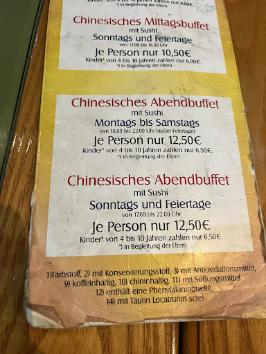 Read moreWir waren zu zweit an einem Feiertag hier, mäßig besucht gegen 19 Uhr, wir haben direkt einen Tisch bekommen, sehr nette und freundliche Bedienung, uriges chinesisches Ambiente, sauberes Erscheinungsbild. Es gibt NUR Buffet (18,90 €), kein Essen von der Karte (dessen waren wir uns aber bewusst), Buffet Auswahl durchschnittlich, einige Speisen lagen wohl schon etwas länger, die Soße bildete schon Haut, genau wie die Soßen, sah nicht so Appetitlich aus, desweiteren die Kärtchen/Zettel wo die Gerichte am Buffet drauf stehen, stark abgenutzt und beschmutzt, sollten mal erneuert werden. Die Speisen die wir probiert haben, waren aber lecker und warm, Sushi war auch lecker, aber schnell vergriffen. Enttäuscht waren wir vom Nachtisch/Dessert Angebot, 4 Sorten Eis, bißchen Obst, Götterspeise,...