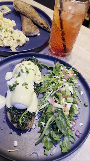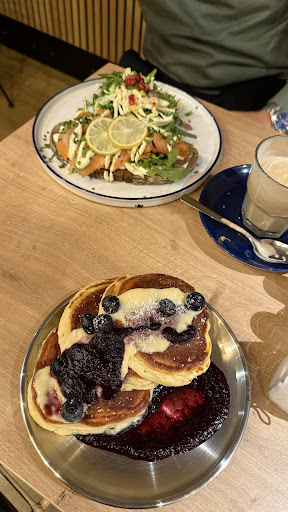 Read moreWir waren zum Frühstück hier und im großen und Ganzen entsprach der Besuch meinen Erwartungen. Jede Menge #Foodporn :) Das Essen war gut, aber geschmacklich und von den Zutaten her nichts Besonderes - dafür sehr schön anzusehen. Bei den Landbroten und Eiergerichten finde ich das Preis-Leistungsverhältnis in Ordnung. Eine normale Smoothie-Bowl für 12-14 Euro halte ich dagegen für unverhältnismäßig. Völlig durchgefallen ist für mich das Bananenbrot für 4,90 Euro pro Stück. Das war kein Bananenbrot, sondern ein recht trockener Kuchen mit offenbar zu wenig Banane im Teig. Alles andere hat gut geschmeckt. Ich finde es schade, dass man für maximal zwei Stunden reservieren kann. Bei viel Andrang am Wochenende ist das zwar nachvollziehbar, aber entspricht natürlich nicht dem Brunch Prinzip. Daher ist der Begriff etwas irreführend. Es ist zeitlich kaum nicht möglich, Elemente von Frühstück und Mittagessen zu verbinden. Mal abgesehen davon, dass die meisten Gerichte recht sättigend sind und man dann auch nur eins braucht. Die Akustik ist sehr laut und die Atmosphäre war an einem Sonntagvormittag bei voller Belegung recht hektisch. Die KellnerInnen sind sehr durch die Gegend gehetzt und wirkten gestresst. Einzelne bestellte Getränke kamen teils erst nach mehrfacher Nachfrage und es schien auch keine klare Aufteilung zu geben, welcher Kellner für welche Tische zuständig ist. Daher war es ziemlich durcheinander, aber es gab auch ein Problem mit dem Reservierungssystem - daher ist es sonst vielleicht geordneter. Ganz ganz toll fand ich, dass jedem von uns am Ende ein Heißgetränk zum Mitnehmen gratis angeboten wurde, weil wir sehr lange auf Bestellungen gewartet hatten. Die KellnerInnen waren super bemüht und freundlich, das hat viel rausgerissen. Daher war das Gesamterlebnis positiv und ich würde dem Café auch noch eine zweite Chance geben, wenn es sich etwas eingespielt hat. Ein Vorschlag noch an die Betreiber: Ich finde es super und sinnvoll, dass man übers Handy die Gerichte selbst bestellt. Aber die digitale Speisekarte hat uns alle ziemlich verwirrt und genervt, weil viele Gerichte unter drei verschiedenen Kategorien aufgeführt werden und man deshalb ewig braucht, bis man alles durchgeklickt hat und immer wieder die selben Sachen liest. Das ginge viel einfacher. Z.B. über ein Symbol für vegane Gerichte o.ä. Wir haben für die Bestellung allein eine halbe Stunde gebraucht...