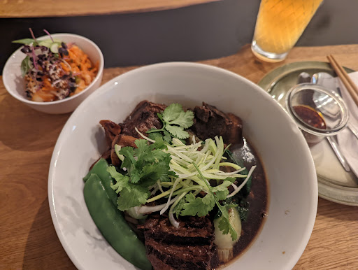I finally got to try this place (twice this month) and seriously, it is one of the best restaurants in Köln. First of all, what a kicka$$ menu. Its minimal but hits all the spots. The dumplings are gorgeous, juicy and made with organic meat, the noodle soups are heavenly spiced, and the drinks are mostly hand made with cool flavour combinations. I mean really, this place is not to confuse with your normalo asia curry/sushi shop dishing out the basic spice mix with whatever protein added in. I asked the waitor and was told that the soup broths, both the meat and vegan varieties, simmer for hours on the stove to create the deep blend of flavours you can't acheive by just chopping and dropping into a wok. No MSG. You can taste the difference. Homemade chili crunch? YES PLEASE. Also to mention are the vibes. The warm lighting, wood/antique furniture, plants everywhere and a beautiful outdoor area in the back made set a cozy tone. I noticed many guests just hanging for a while to chat and enjoy the atmosphere. The waiters/waitresses seemed a bit stressed, but it was saturday night and everyone was still totally friendly/helpful (like they actually wanted to be there on a Saturday night). The cook walked by to smoke outside and took a moment to ask us how everything tasted. What a sweetheart. I almost forgot the best part: the techno was absolutely bangin'. Although we waited like 30 minutes for our food, it was well worth it. One of a kind spot. Thank you thank you....