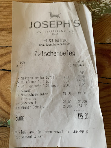 Read moreOn a rainy Wednesday evening, I depart and traveled to Joseph's to get a schnitzel. I arrived at Joseph's at 9:19 p.m (21:19) and happily waited at the front to be seated. I was greeted by a male that said the kitchen is closed but you can get beer. I kindly asked what time the kitchen closed and the man replied 9:30 p.m. (21:30). I looked at my watch and said it's "9:21 p.m.". If the restaurant not been (what appears to be) at LEAST 50% occupied (outdoor patio also over 50% full), I would understand why they would want to clock out slightly earlier. Please note that prior to heading out on my journey to Joseph's I checked the restaurant's website and it states that the kitchen closes at 10:00 p.m. (22:00). I tried to chage the persons mind with fail. The male was firm and would not accommodate. It is very disappointing and misleading. I wasted my precious time. I'm traveling through Köln for only 3 days and wanted to make the most of it. I feel robbed of a great dinner elsewhere. Had the restaurant had correct information on THEIR OWN WEBSITE (https://www.josephs-koeln.de/reservierung/) I would be able to say that I enjoyed Köln to the fullest. I'm literally left in the dark, hungry, wet and cold. I'm quite a positive person but the options were scarce in this area at this time. It is very unfortunate that Joseph's refused to honor what they have started on their website. Very unprofessional. Very disappointing. Very Misleading. Very Lazy. I hate to leave a low review however I strongly feel this 1 star is well deserved for being wrongfully turned away.