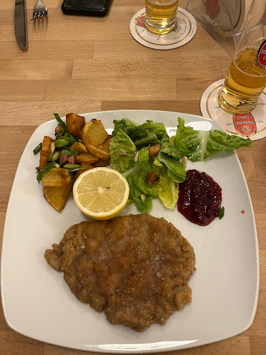 Read moreWir hatten das Wiener Schnitzel für 25€ nach 1:20 Stunden Wartezeit. In der Karte hieß es "Mit Beilagensalat und Bratkartoffeln". Das Schnitzel hatte eine komische Farbe: trist und gräulich, geschmacklich aber okay. Jedoch auch eher klein. Was jedoch lächerlich war, waren die Beilagen: wir hatten jeder um die 7 Blätter Kopfsalat auf dem Teller. Das als Beilagensalat zu verkaufen, ist eine Frechheit. Ähnlich war es mit den Kartoffeln. Mehr als 5 Gabeln waren das nicht. Wir waren alle drei nicht satt und haben trotzdem 100€ gezahlt. Wenigstens das Reissdorf hat gewohnt gut geschmeckt. Wir haben der Kellnerin auch bescheid gegeben, haben aber nur eine kleine Portion Kartoffeln, 20 Minuten später erhalten, als wir alles bereits aufgegessen hatten. Essen gehen werden wir...