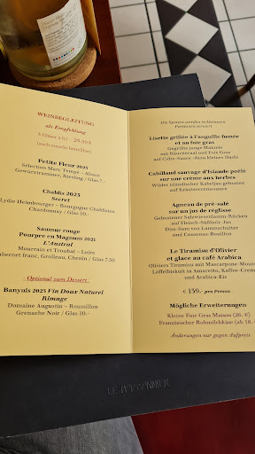 Read moreMy husband and I were in town for work and a friend back home suggested this restaurant. I was able to make a reservation online which I appreciated, since I don’t speak German. I was able to correspond with the restaurant via email and they were very quick to reply. Yelp has this listed as formal attire and so I quickly emailed them to cancel my reservation. I got an immediate reply back stating that was not the case. I was so relieved! We walked there from our hotel and as we got closer, I was sure we were going the wrong way. Luckily google led us correctly and we arrived right on time. There was no door to open, rather you pulled a thick curtain back and you are immediately transported into a lovely French bistro. You are greeted by a host to confirm your reservation and then seated. Several people waited on us in English. Our menu was also in English. We decided to do the tasting menu with wine pairing. We were not disappointed. Every single dish was not only a beautiful presentation, but it was seasoned perfectly and tasted divine. The service was also super attentive and friendly! My husband and I both agreed that this was by far the best meal we’ve ever had. I highly recommend this restaurant and even though the price point was on the higher end, it was absolutely worth every...