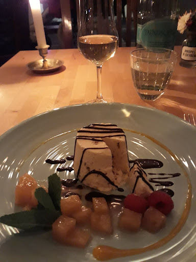 Zur Nachspeise hatte ich ein Heidelbeer-Sorbet, dies war lecker, leider garniert mit gekaufen Schokokugeln (warum nicht einfach einen Crunch selber machen?) und unter dem Eis war ein nach nichts schmeckendes Geleé, dessen Funktion mir unklar war. Andere am Tisch hatten eine Crème Brûlée - in dieser war keine Spur von Vanille enthalten, auch die Konsistenz war seltsam. Ich habe oft selbst Crème Brûlée zu Hause für Gäste gemacht, normalerweise setzt sich unten in der Ofenform etwas Vanille ab, ansonsten ist dieses Gericht kein Hexenwerk.