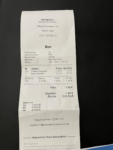 Besuch heute bei Merzenich an der Maybachstraße. Um kurz vor 11 Uhr bereits überhaupt kein Zirbelbrot mehr verfügbar. Daher Umentscheidung auf halbes Baguette. Verkäufer kann halbes Baguette nicht verkaufen. Muss erst fragen, ob er ein halbes Brot verkaufen darf. Nach Klärung der Sache Teilung des Baguettes in zwei Hälften. 1,30 Euro wurden passend hingelegt. Rechnungsbetrag plötzlich 1,40 Euro: 10 Cent für Brot schneiden!! Habe ich in über 20 Jahren nicht erlebt so eine Frechheit. Mitarbeiter behauptet, dies hätte seine Richtigkeit. Wurde nach meinem Einwand von der Filialleitung auch noch arrogant bestätigt. Das sind nicht mehr meine Werte und meine Preise. Künftig nur noch Brot aus dem Supermarkt. Zur Erinnerung: Ein GANZES Baguette kostete im August 2018 noch 1,20 Euro und da war der Preis zuvor schon von 1,10 Euro auf 1,15 Euro und schlussendlich auf 1,20 Euro...