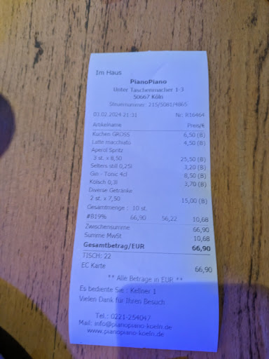 Read moreI was about to leave a good review but when I looked at what I paid for the table I changed my mind. They charged 15€ for "diverse Getränke" which none of us has ordered. We had 2 cakes and eclair in addition to the drinks. One cake they charged, and instead of charging for one more cake and one more eclair they charged 15€ for "diverse Getränke".