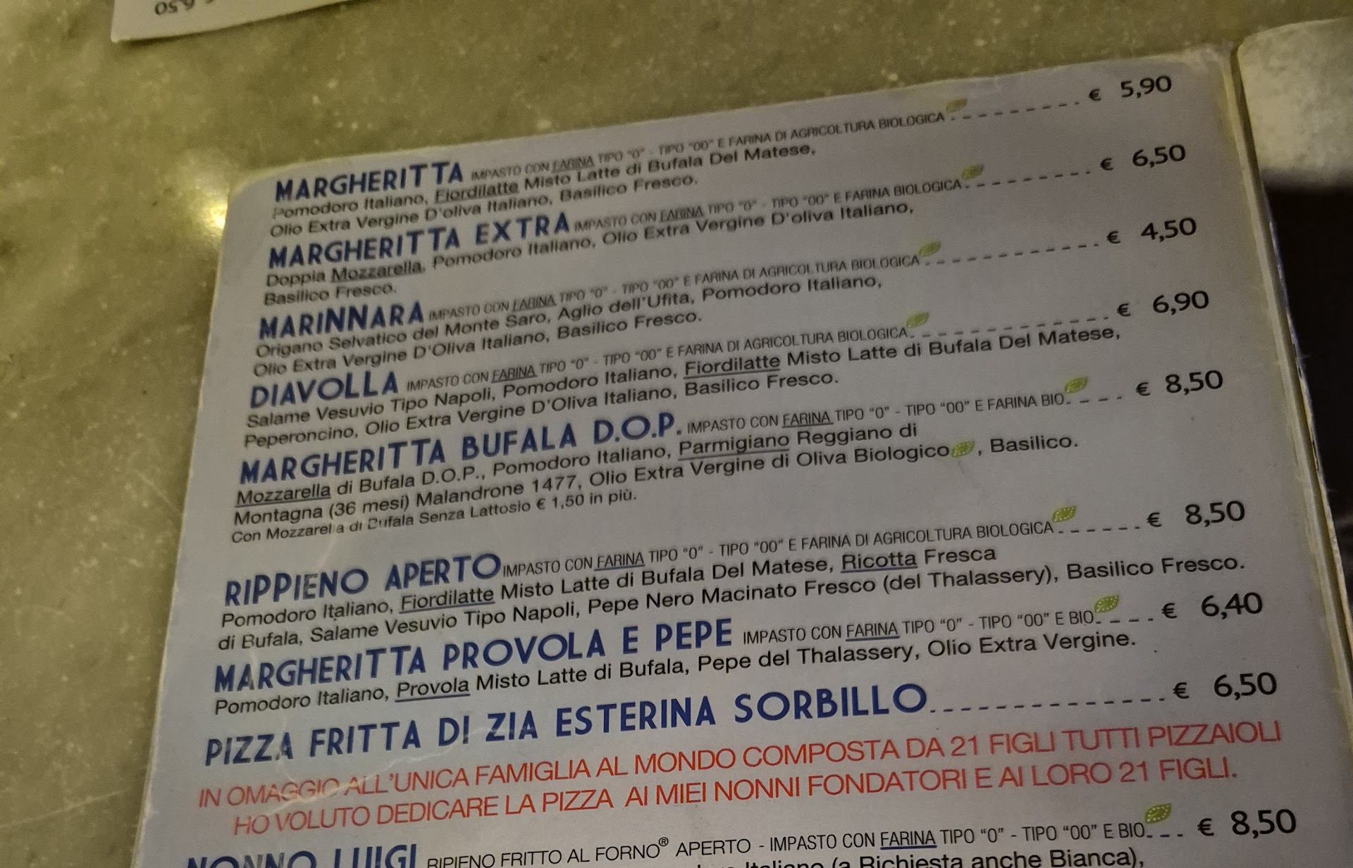 Die getesteten Pizzen wiesen ebenfalls Mängel auf. Die Pizza Margherita kam ohne die erwarteten frischen Basilikumblätter an den Tisch. Der Boden war zwar schön dünn und perfekt gebacken, jedoch völlig ohne Eigengeschmack. Die Tomatensoße präsentierte sich ziemlich säurig und ebenso wenig gewürzt, und der verwendete Käse wirkte wie eine einfache 0815-Variante.