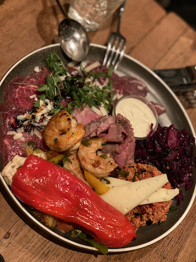 So coming to the most important part, the food, I have to say: incredible delicious. As a starter we took the āall-in-one-plateā to get a chance of tasting more or of all options. Itās coming in a size which was actually pretty fair for four persons. In the main course we had tuna steak, manti and regular stake and I can and need only to say: unbelievable! Very delicious, the portions are not to small and everything was just fresh. We finished our dinner journey with Kazims cocoa cake containing a warm chocolate sauce, the pistachio ice in a Baklava and the āapple bagā. All three desserts were absolutely fantastic. Enjoyed each little piece of them.
