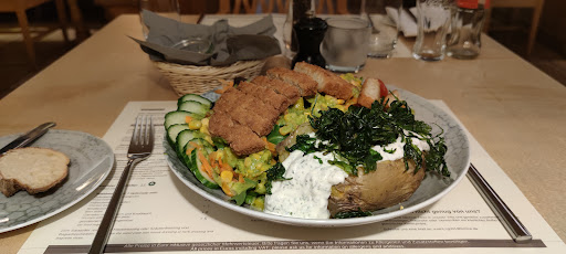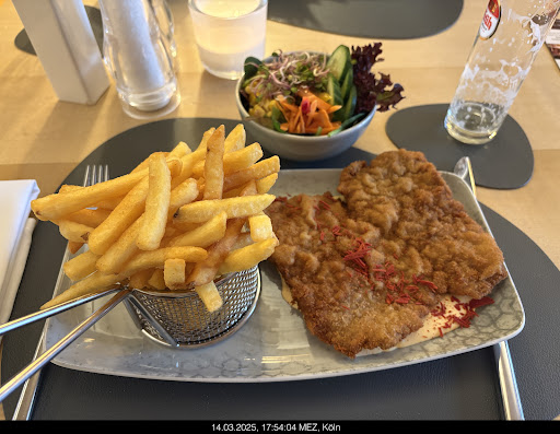 Read moreDas Schnitzel „Jäger Art“ war lecker samt Beilagen. Der Salat kostet 3€ extra, und war in Ordnung. Als Nachtisch habe ich das Grießtörtchen mit Rhabarber und Mousse au Chocolat bestellt. Als es gebracht wurde habe ich sicherheitshalber gefragt, ob da Alkohol drin ist (steht nichts auf der Karte). Da ich im 8. Monat schwanger bin, also schon sichtlich, hatte ich bei der Bestellung zunächst nicht danach gefragt. Es stellte sich heraus, dass in allen Zutaten Alkohol verarbeitet wurde. Es wurde dann gegen ein Schokoküchlein getauscht und der Kellner war sehr nett. Es wäre dennoch toll, wenn man einen Hinweis auf der Speisekarte anbringt, wenn irgendwo Alkohol verarbeitet wurde. Das ist nicht nur für Schwangere wichtig, sondern auch für trockene...