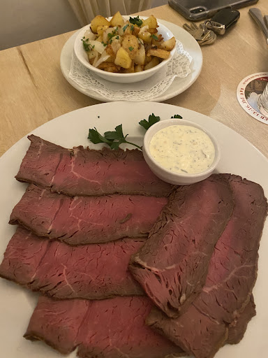 Die einzige Option richtig phantastisch zu speisen !!! Dienstags gibt es Reibekuchen, die sind nicht von dieser Welt !!! Wir hatten jeder einen mit Tatar, Zwiebeln und Gewürzgurken als Vorspeise, diese Kreation war mir unbekannt , aber diese Geschmacksexplosion führt jetzt beim Schreiben wieder extrem Drang in mir, direkt diese wieder zu bekommen !!! Das Selbe gilt auch für meine Kalbsleber !!! Ich liebe Leber und wo es diese gibt, wird Sie auch bestellt. Jetzt nur noch dort, denn diese Messlatte ist nicht mehr zu toppen !!! Das Roastbeef ebenso !!! Frische, Qualität, Fachwissen, Freundlichkeit, Gemütlichkeit, ein einzigartiges Rezept, andem Nachahmer kläglich scheitern werden !!! Die Krönung zum Ende eines schönen Abends ist dann noch der Pfannkuchen mit Vanilleeis in verschiedenen Kreationen bestellbar !!! Ich habe Ihn leider nicht mehr geschafft, denn die Gerichte sind sehr reichhaltig, niemand wird dort hungrig Nachhause gehen !!! Meine Freundin allerdings lässt sich diesen nie...