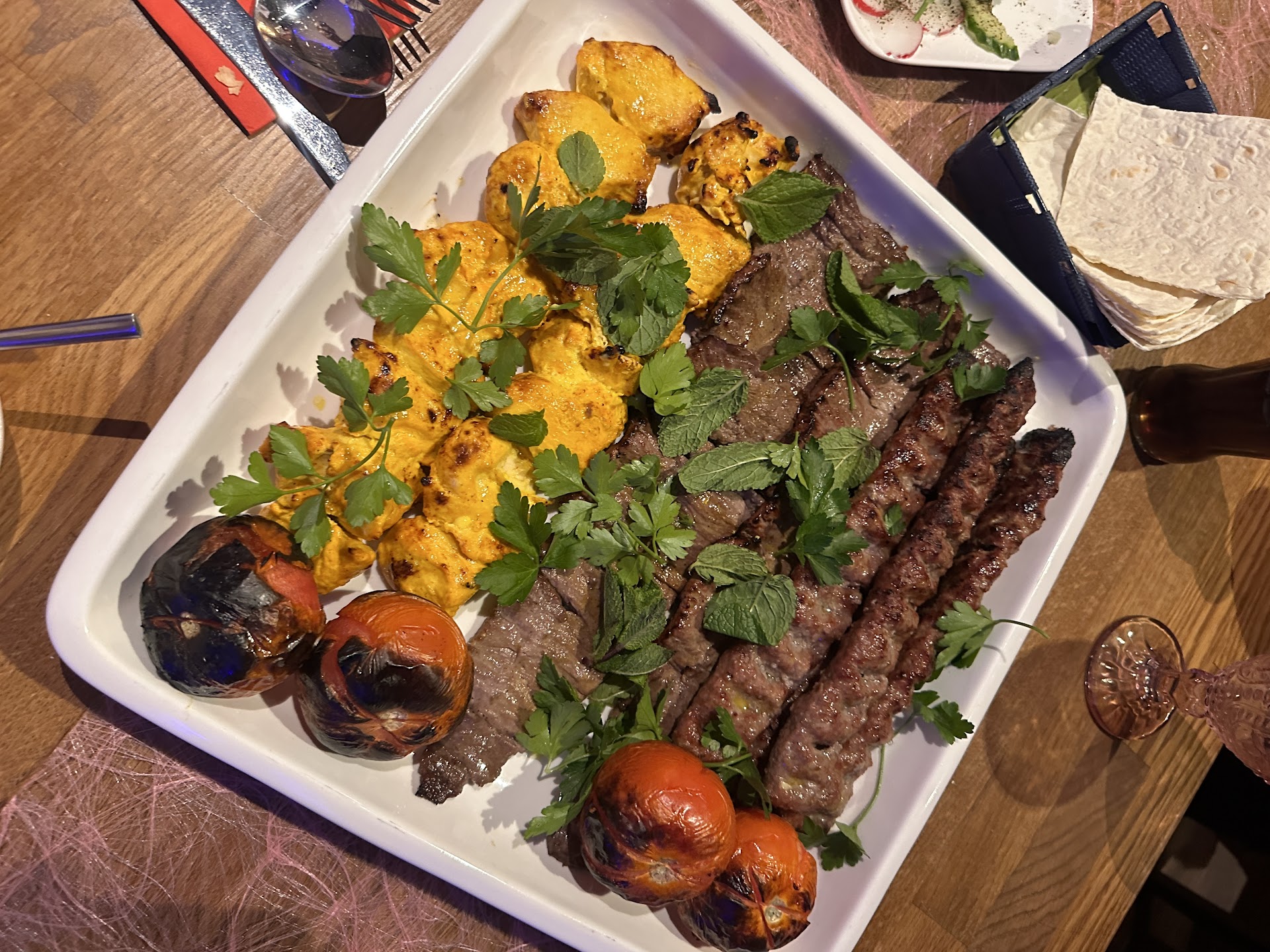 Das Essen war okay, zum Glück hatte meine Frau keinen Hunger und so sind wir von der Platte für 55 Euro gerade so satt geworden sind. Man bekommt beim Iraner in der Regel immer viel Reis und wenig Fleisch das ist hier nicht anders und von daher normal. Das der Reis aber kein Tadik (Reiskruste) hatte war sehr schade. Zum Fleisch und zum Reis gibt es keine Soße, jugurt, Zaziki oder der gleichen. Lediglich ein Stückchen Butter. Obwohl das Fleisch einigermaßen saftig war macht es keinen Spaß so trocken zu essen. Man kann sich jugurt als Vorspeise bestellen was aber auch nicht günstig ist. Die gegrillte Tomate ist von außen schwarz was sich so gehört aber leider von innen noch hart und nicht besonders warm. Ich habe mich im Laufe des Abends gefragt warum Iraner hier essen gehen. Meine Vermutung ist das die Leute nur wegen der Musik kommen.