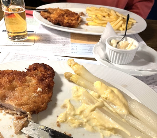 Kochen kann er!!!! Und neben all dem hippen Kram ist das ja wohl die Hauptsache. Freitag hatten wir echtes Wiener Schnitzel und Schweineschnitzel mit Spargel. Saftig, auf den Punkt, frisch zubereitet: lecker!!!!!
