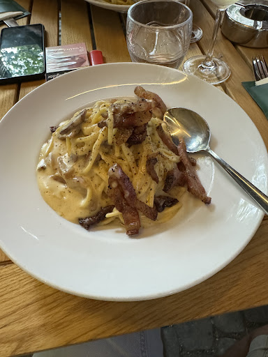 Der Service wirkte leider vollkommen überfordert und unkoordiniert. Wir saßen in einer Reihe mit 3 nah beieinander stehenden Tischen. An jedem dieser Tische waren entweder Getränke oder Gerichte vertauscht oder komplett falsch und Bestellungen scheinbar durcheinander geworfen worden. Leere Gläser, Flaschen und Vorspeisenteller stapelten sich langsam auf unserem doch recht kleinen Tisch aber keine Servicekraft kam auf die Idee diese hin und wieder mitzunehmen. Erst als die Hauptspeise nicht mehr auf den Tisch passte wurde auch erst auf Nachfrage abgeräumt. Die Vorspeise, eine Tomatensuppe war geschmacklich gut, der kleine Mischsalat jedoch schon recht dürftig. Die Hauptspeise beinhaltete eine "Pinsa" die als rechteckige Pizza dargeboten wurde, welche nicht einmal die Hälfte des darunter liegenden Pizzatellers ausfüllte. Geschmacklich kann man nicht meckern, jedoch ist der stolze Preis dafür nicht gerechtfertigt.
