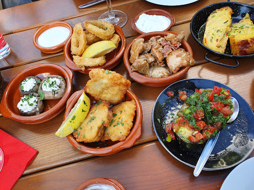 Auf den Bildern sind folgende Tapas zu sehen (teilweise aus der Saisonkarte) Champignons mit Ziegenfrischkäse Panierte Tintenfischringe Seelachs im Bierteig Hühnchen mit Serrano in Sherrysauce Gegrillte Avocado Tortilla mit Gemüse Hackfleischbällchen (Rind) in Tomatensauce Chorizo Frittierte Kartoffeln Ziegenkäse mit Honig und Thymian