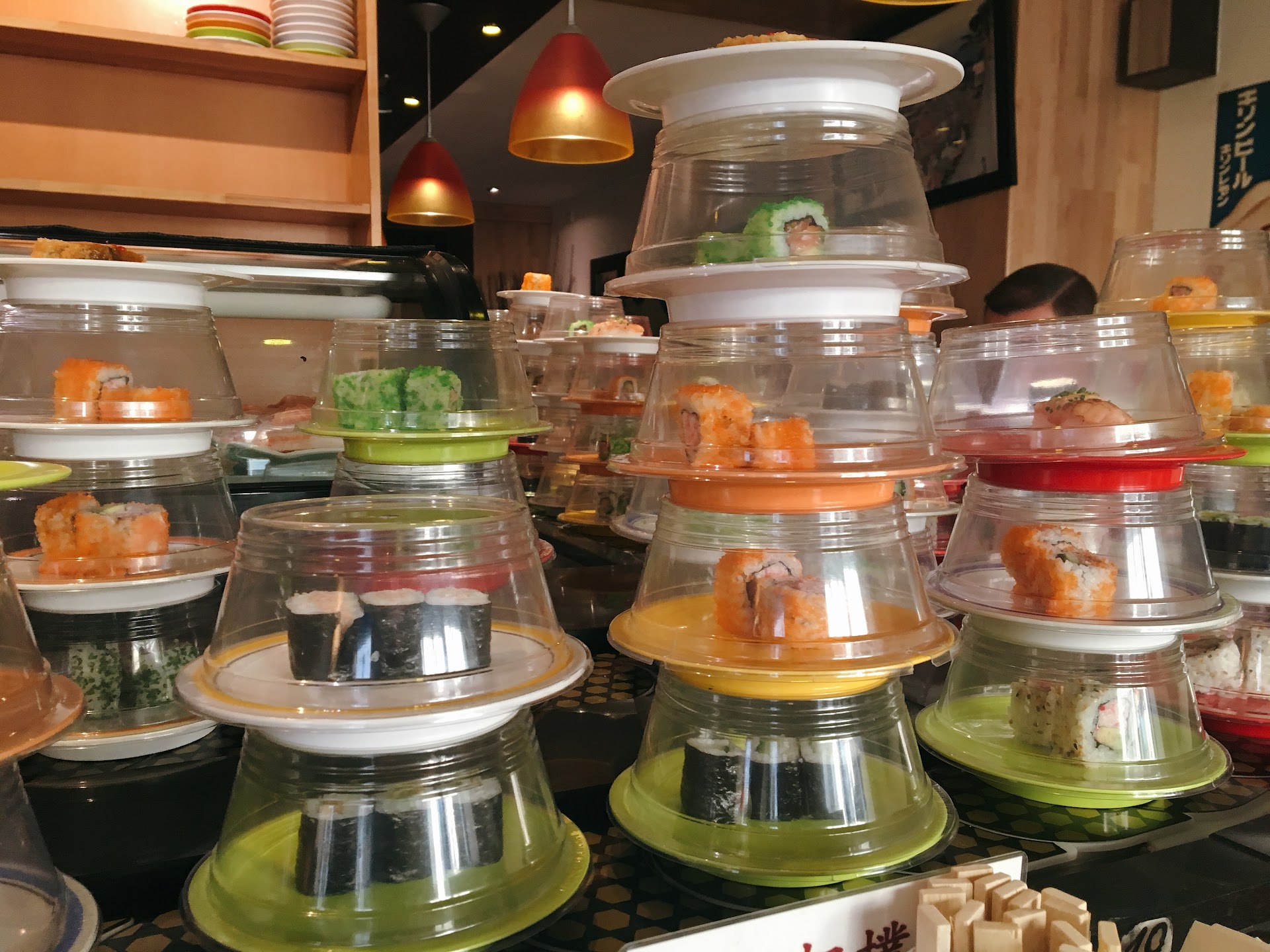 Wie schon erwähnt, erwartet auf gar keinen Fall die Auswahl, wie es auf alten Bildern zu sehen ist. Die Hälfte der Zeit war das Laufband leer, nur die Sojasauce drehte einsam ihre Runden. Wenn jemand neu kam wurde was draufgestellt, aber immer nur so viele Teller von den 5 Sorten, wie Personen.