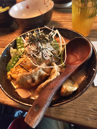 I really enjoyed the food. We were with 4 people and we all got something different. I got the veggie one with tofu and tempeh. There was this vegetable which was very chewy and i couldn't eat so i picked those out eventually. The person with me got one with pork, but there was barely any meat and halve an egg. With the veggie ramen they also added 3 gyozas, very delicious. The veggie ramens were more expensive than the once with meat, which was surprising. The atmosphere was cozy and cute, but i dont know if it were the people who walked in or something in the restaurant, but at the end there was this foul smell i could not shake. You do get a big bowl of ramen, but for 19,8 for tofu, tempeh, vegetables and noodles. Its a bit too much for me while the meat once were around 15/16 euros. Eventually we left no crumbs, but overal a 4/5, because the service was good and fast. The atmosphere was good (except at the end, but i do not know what the reason for it would be) but the price and...