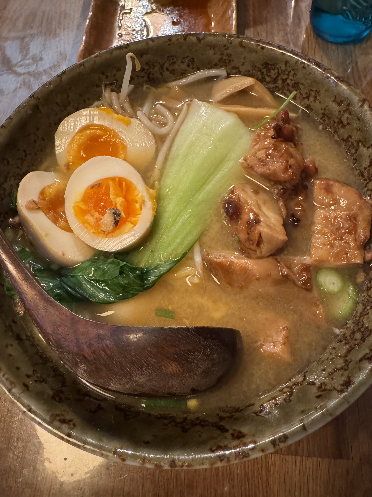 I really enjoyed the food. We were with 4 people and we all got something different. I got the veggie one with tofu and tempeh. There was this vegetable which was very chewy and i couldn't eat so i picked those out eventually. The person with me got one with pork, but there was barely any meat and halve an egg. With the veggie ramen they also added 3 gyozas, very delicious. The veggie ramens were more expensive than the once with meat, which was surprising. The atmosphere was cozy and cute, but i dont know if it were the people who walked in or something in the restaurant, but at the end there was this foul smell i could not shake. You do get a big bowl of ramen, but for 19,8 for tofu, tempeh, vegetables and noodles. Its a bit too much for me while the meat once were around 15/16 euros. Eventually we left no crumbs, but overal a 4/5, because the service was good and fast. The atmosphere was good (except at the end, but i do not know what the reason for it would be) but the price and food was meh.