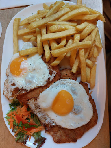 Read moreWir haben zu viert bei der Hitze super draussen vor dem Lokal gesessen, und es wurde ein wirklich schöner entspannter Abend. Der Kellner war ausgesprochen aufmerksam und auch noch witzig dazu ! Kölner Humor ! Wir hatten vier unterschiedliche Gerichte bestellt, und angenehmerweise kam das Essen für uns gleichzeitig (was ja viele Restaurants nicht schaffen). Jeder fand sein Gericht sehr lecker, und ich war super glücklich mit meinen 2 mittelgroßen Schnitzeln mit 2 Spiegeleiern und Pommes Frites ( ab und zu habe ich unheimlich Lust auf diese Kombination). Das Fleisch war sehr lecker und die Panade und Pommes Frites waren knusprig. Das war nicht das letzte Mal, dass wir dorthin gegangen sind ! Die Tagliatelle mit Lachs von meinem Tischnachbarn waren auch besonders lecker, die werde ich auch mal bestellen. Auf der Speisekarte gibt es so manches, was ich mag. Weil aber das Schnitzel so viel besser als in anderen Lokalen war, werde ich es dann wohl doch beim nächsten Mal wieder bestellen ( und die anderen Gerichte...