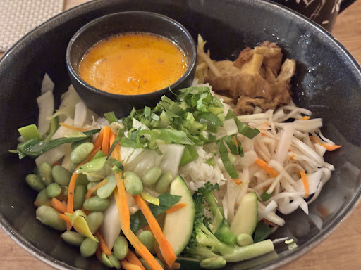 Ordered the Curry (No. 27) with Tofu and Seitan and the Jasmin Tea. The presentation was absolutely beautiful and the tea was delicious. The food had fresh ingredients, the curry sauce was very well balanced. Also the tofu and seitan were marinated to perfection and were one of the most delicious marinated vegan ingredients I've had in a while. The only slightly bad thing were the proportions. They could have served it with a bit more of the curry so that the whole dish wasn't faintly underwhelming in terms of spice. Also could've done with a bit higher amount of tofu/seitan. The atmosphere and the service were absolutely bang-on and top-notch though. As a follow-up, I tried the Tori bowl. From the sizes of the cut ingredients to the textures and the freshness and the marination of the chicken and the amount of the homemade sauce was perfection. I was initially skeptical about a viscous sauce- rice combination but everything blend into a perfect combination of flavour, from the soft chicken to the super fresh cucumber and the perfectly...