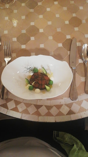 Ambiente und Geschirr mit Marokkanischem Flair. Teller und Besteck in hörbarem Kontakt mit dem Mosaikdekor des Tischchens ohne Tischdecke. Zum Auftakt des 4-Gang Menues bekamen wir in kleinen Schälchen eine Auswahl von Dips und Salaten aus dem Mittelmeerraum und dem nahen Osten. Dazu gab es Stückchen von Sesamkringeln und einer Art Brioche. Letztere geschmacklich leider nicht passend und der Konstistenz einiger Dips nicht gewachsen, zerfiel beim Dippen zwischen den Fingern. Hummus, den ich in Israel sehr gerne gegessen habe, war etwas schwach und schmeckt mir hausgemacht besser. Verwunderung löste ein Schälchen mit eingelegtem Ingwer aus, wie man ihn aus der japanischen Küche in Kombination mit viel Umami kennt. Hier gab es leider gar nichts womit man ihn gerne hätte kombinieren wollen. Bis auf ein feines Lachstartar war alles andere nett zu probieren, aber nicht news breaking. Es folgte eine sehr schmackhafte Yoghurtsuppe, ein zart geschmortes Rindfleischgericht und ein wiederum hervoragendes Dessert. Die offene Weinauswahl - gewählt wegen eines Weinwechsels innerhalb des Menues, ist mit jeweils 4 Weiß-/Rotweinen sehr begrenzt. Positiv ist, dass die Flasche am Tisch präsentiert wird. Da die Weinkarte keine Auskunft über die Glaseinheit gibt, (sollte sie das nicht?) ist man überrascht, wenn die vorplazierten Weingläser mit eingeschliffener 0,2 l Markierung am Tisch mit geschätzen 0,1 l befüllt werden. Bei Preisen ab 8,00€ pro Glas wird die Luft...