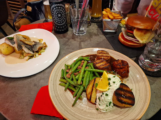 The ambient is nice, the chairs confortable. The food was really nice looking and tasty. They have a menu 12-15h for better price (9.99euros aprox), or you can take from the normal menu. The dorado fish was from the menu (left). The schweinfillet was really nice, for 20 euros (mittle) The burger was around 15 and was with the hole meat (not minced). The service was friendly, and fast. She was pendant if there was anything needed there. There is no parking as it is in the zentrum platz. I recommend park near the spree mall and walk. The entrance is on a side. The bathroom is on the...