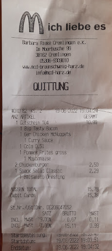 Pommes und Curly Fries kaltund pappig. Royal TS lauwarm, McChicken unwürdig gebastelt und lauwarm, Cheeseburger kalt aussen, innen knappe 30Grad.(Mit der Wärmebildkamera aufgenommen und die Fotos gespeichert) Da das Eis in den Getränken bereits geschmolzen war, ist davon auszugehen, das der Wagen vor uns unsere Bestellung erhalten hat und die, nach Rückkehr in den Kreissaal und hinzufügen der heißen Chicken Nuggets, an uns ging. Alles in Allem ein unterirdischer Service in der Systemgastronomie. Ist das heute zeitgemäß? Muß man als Verbraucher einfach stumpfer sein heutzutage? Ich persönlich habe jahrelang auf McDonald's verzichtet. Und genau dafür ist es jetzt wieder Zeit. Bis die verdammte Hölle...