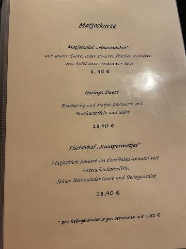 Für uns Städter noch erstaunlich gut Getränkepreise bei guter Auswahl. Der Hammer aber ist das Essen: die Karte umfasst natürlich hauptsächlich Fischgerichte, aber auch anderes. Die Sülze war eine der besten, die ich je hatte, dazu perfekte Bratkartoffeln. Das Knusper-Matjesfilet eine Überraschung- sowas kannten wir noch nicht. Alles wunderschön angerichtet, man merkt, dass da ein Profi in der Küche arbeitet, der seinen Beruf liebt. Der Höhepunkt: Das Überraschungs-Dessert. Das bekommt man auch in Sterne-Restaurants nicht...