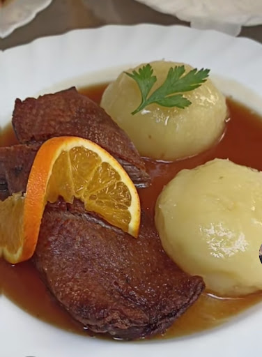 Das Ganze hat dann 45€ gekostet… Die Sauerbratensoße war leider nicht sehr lecker. Sie schmeckte so als wurde sie bereits gestreckt - und ich hatte vorbestellt… Die Klöße waren außerdem sehr sehr klein. (siehe Bild) Auf dem anderen Bild sieht man einen Braten plus die Soße für vier Klöße… Das hat hinten und vorne nicht gereicht.