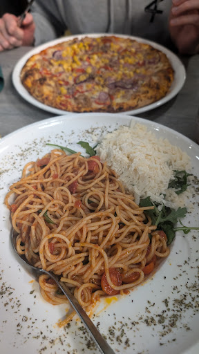 Qualität der Speisen und Getränke: Zu den Getränken kann man nur sagen das man das bekommen hat was man bestellt hat, und zwar in der richtigen Temperatur. Die Vorspeise kam ruck-zuck (Panini und extra bestellten Salat). Beides war schmackhaft. Bestellt wurden dann zwei Pizzen: einmal eine normale, einmal eine extra dünne. Bedauerlicher Weise scheinen beide Pizzen im gleichen Ofen mit der gleichen Zubereitungszeit fertig gestellt. Hieß: die extra dünne war extrem angebrannt - nicht essbar. Die zweite Pizza (extra OHNE Peperoni bestellt) wurde MIT Peperoni serviert. Beide Hauptspeisen "misslungen" bedeutet für mich eine klare Abwertung des Lokals. Die "Peperoni-Pizza" wurde so gegessen: schmeckte soweit ganz gut, aber nicht unbedingt hoch lobenswert. Die "Extra dünne" wurde nach der Reklamation zurück gegeben und durch Spagetti. Diese waren ebenfalls lecker und solider Durchschnitt.