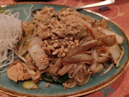 Das Tofu war kaum gewürzt und somit geschmacklos, die gereichte rote Curry Soße dünn und nicht scharf. Nudeln mit Huhn waren auch sehr geschmacklos während das Huhn einfach nur paniert und frittiert war mehr wie ein deutsches Hühnerschnitzel. Auch das thailändische Nationalgericht von der Karte Pad-Thai hatte leider nichts mit einem Pad-Thai zu tun und schmeckte eher genau so wie die Nudeln unter dem frittierten Hünchen, obwohl das laut Karte ein komplett anderes Gericht sein sollte.