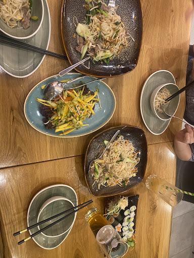 Read moreWir waren zum Mittagessen da, an sich ein schönes Restaurant Ambiente. Wir hatten die Garnelen Suppe und leider war in der ganzen Suppe nur eine Garnele drinnen und auch noch mit Haut, aber sie hat geschmeckt. Dann haben wir Sushi und ein Gericht bestellt. Beim Sushi hat der Mitarbeiter uns anstatt der Crunchy Lachs Rolle die vegetarische serviert und wir haben erstmal nichts gesagt, da es in Ordnung für uns war und es gleich viel gekostet hat. Aber beim darauf hinweisen danach, hat er seinen Fehler nicht eingesehen bzw. Deutsch nicht so richtig verstanden und sich nicht entschuldigt. Zudem waren zu dem Zeitpunkt mit uns nur ein weiterer Tisch da und eine Person die etwas abgeholt hat und obwohl also nicht viel los war, hat der Mitarbeiter bei uns etwas falsch gemacht und auch bei der abholenden Person. Personal ist somit nicht so aufmerksam und versteht einen nicht richtig. Das Gericht Bandnudeln Curry mit Ente war sehr lecker aber leider ein kurzes Haar darin gefunden, was nicht so appetitlich war. Also alles in allem eine...