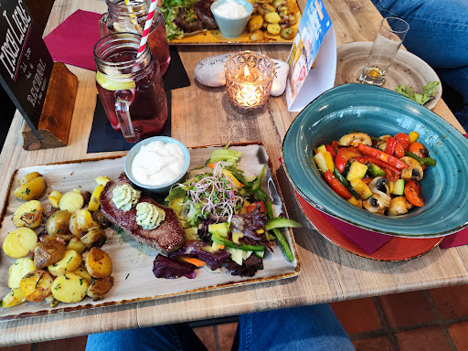We had a good lunch here and decided to go back for dinner on a Thursday evening: big mistake! Instead of the regular menu, they had a “bar—b-cue” with live music. The only really appealing thing on the menu (steak) was sold out. They had burgers but no fries. They charged extra (a lot!) for roasted potatoes, and we received tiny portions of these. They charged over 7 euros for a mixed salad which clearly came out of a bag (definitely not fresh). To top it off, the music was horrendously bad; completely ruined what might have at least been a nice family evening. When I told the manager about our experience, she politely thanked me, but neither adjusted our bill or even offered us a complimentary dessert or even an expresso: such poor training! Avoid this place at all cost, unless you like to spend 120 Euros for dinner for four people that would have been expensive at...