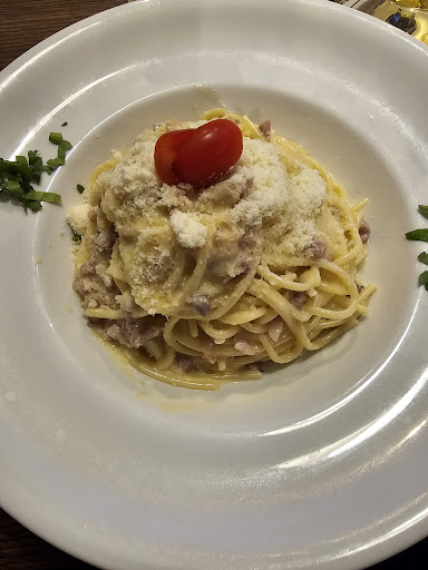 Read moreWir sind Montagabend spontan aufgrund der positiven Bewertungen dort extra hingefahren und eingekehrt, wurden sofort ohne Begrüßung nach einer Reservierung gefragt und als wir verneinten auf die zeltartige Terrasse verwiesen. Dort war es durch starken Regen und Wind leider kalt, feucht und zugig, die Heizstrahler dienen wohl nur zur Dekoration. Plastiktische, nicht eingedeckt, Besteck und Servietten im Bierglas zur Selbstbedienung -stillos. Die Pizza Diavolo war nur mit Cherrytomaten und Salamischeiben belegt, keine Pepperoni, kein Knoblauch, kaum gewürzt. Die Spaghetti Carbonara waren ziemlich klebrig, keine cremige Soße vorhanden, Pfeffer und Salz fehlten völlig, wenig geriebener Käse drauf. Bei 13,70€ für eine Portion hätte man für extra Käsespäne nochmal 2€ zahlen müssen, nein Danke! Mich wundern die positiven Bewertungen. Mag sein, dass der Vergleich fehlt. In Berlin wäre ein Restaurant mit diesen Preisen und der gebotenen Qualität sicher sehr wenig...