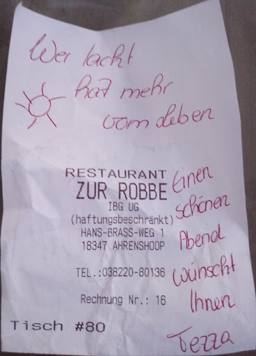 Read moreSie haben Hunger auf ein tolles, leckeres und gutes zubereitetes Essen. Dann, herzlich Willkommen hier in der Robbe. Etwas abgelegen von der Hauptstraße, aber wirklich nur ein paar Meter, finden Sie diese alteingesessene Restauration. Urig, kleinräumig, schummrig verträumt. Und die Belegschaft, hervorragend. Freundlich, wertschätzend und Meister ihres Fachs. Unser Besuch mit unserem Junghund war phantastisch, auch beim nächsten Besuch in Ahrenshoop kehren wir wieder ein. Ach ja, ein Tipp noch zu Hauptessenzeiten und am Wochenende lieber reservieren. Also dann, guck...