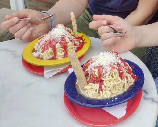 Eine Kugel Eis ist schön groß und kostet 1,50 Euro - das ist inzwischen schon marktüblich; ein Spaghetti-Eis kostet 6,90 Euro; Früchtebecher sind etwas teurer.