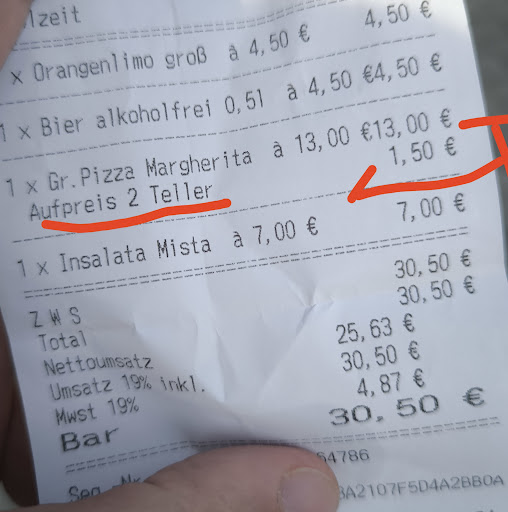Read moreI wanted to share some bad behavior of this pizzeria, apart from the fact that they are not real Italians (they are Croatians) and the pizza is VERY expensive and was NOT the best, I find it a bit difficult to pay 1.5 euros more just because I asked for a second plate because I wanted to share my pizza, apart from that, no credit or EC cards are allowed... so only cash. I would like to see more transparency, the waiter did not warn me of the surcharge. Anyway, I'm not coming...