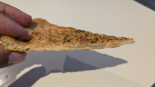 Pizzabrot: Das Pizzabrot war warm und hart wie Knäckebrot. Es hatte auch die Konsistenz von Knäckebrot und zerbrach beim reinbeißen. Keine Ahnung ob das so sein muss. Geschmacklich war es relativ schwach.